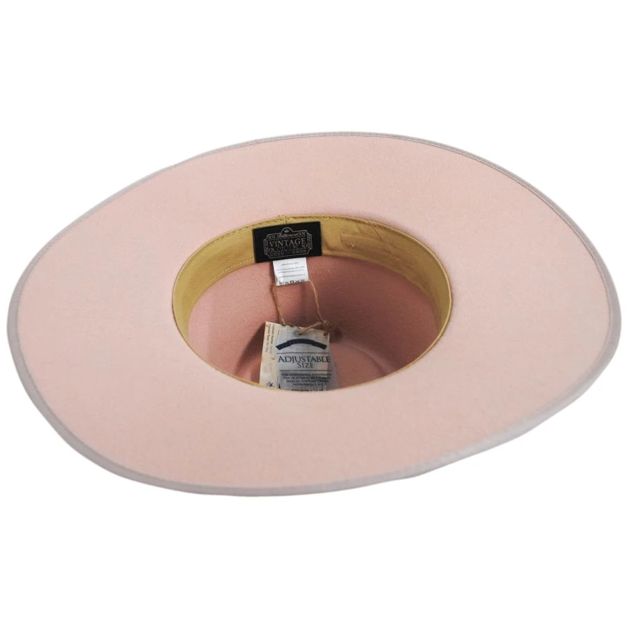 The Vintage Couture Hard Candy Wool Felt Rancher Fedora Hat from Biltmore is a terrific reiteration of a contemporary style. The tall and pronounced teardrop crown has a tonal vegan leather hat band ending with a loop finish at the rear of the crown. Clean lines continue with the tonal grosgrain ribbon binding on the wide brim. This bold shape mellows with the soft blush color, a combination of characteristics that you’ll only see in the Hard Candy Wool Felt Rancher Fedora Hat.