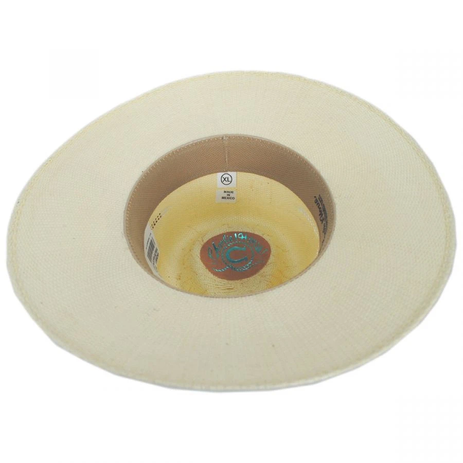 The Tribal Shantung Straw Fedora Hat from Charlie 1 Horse is full of color and is a celebration of well-made straw hats. Made in Mexico of 100% shantung straw, this fedora’s layered hat band steals the show. Double layered with a faux leather bottom layer and a satin tribal patterned scarf on top adorned with metal accent pieces and a leather tooled feather. The beautiful craftsmanship is also demonstrated in the stiff body and tightly woven straw.