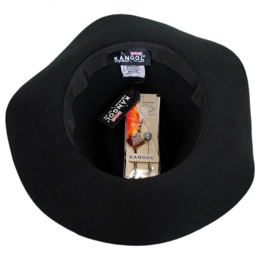 The Barclay Wool Felt Trilby from Kangol Headwear is an American made light weight felted wool fedora with a raw edge and smooth polished finish. The clean design is with only a simple metal Kangol logo side pin.