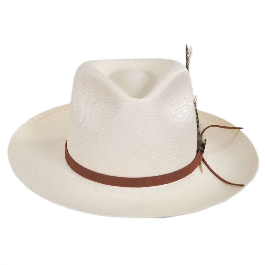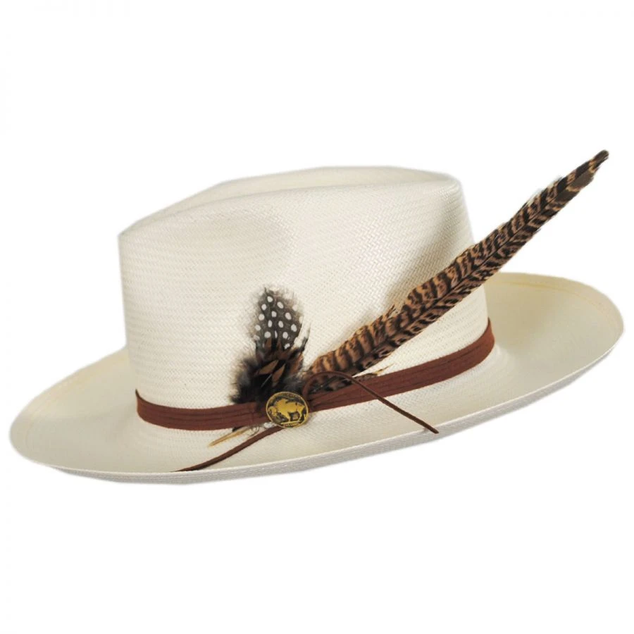 There’s not much else classier than the Tallahassee Shantung Straw Fedora Hat from Stetson. This fedora features a narrow leather hat band, decorated with sensible feathers and a faux buffalo nickel side pin, the perfect combination of style and sophistication. With a leather sweatband, this hat really is a class act!